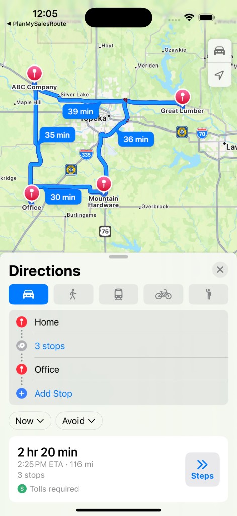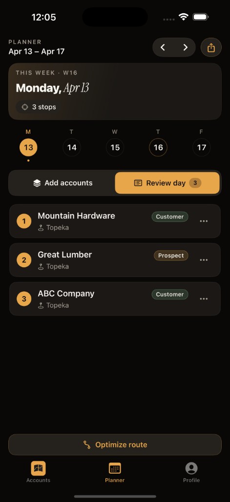 Drop accounts onto the day you'll see them. Move them around as priorities shift. Each day shows a clean stop list with summary stats so you know what you're walking into.
